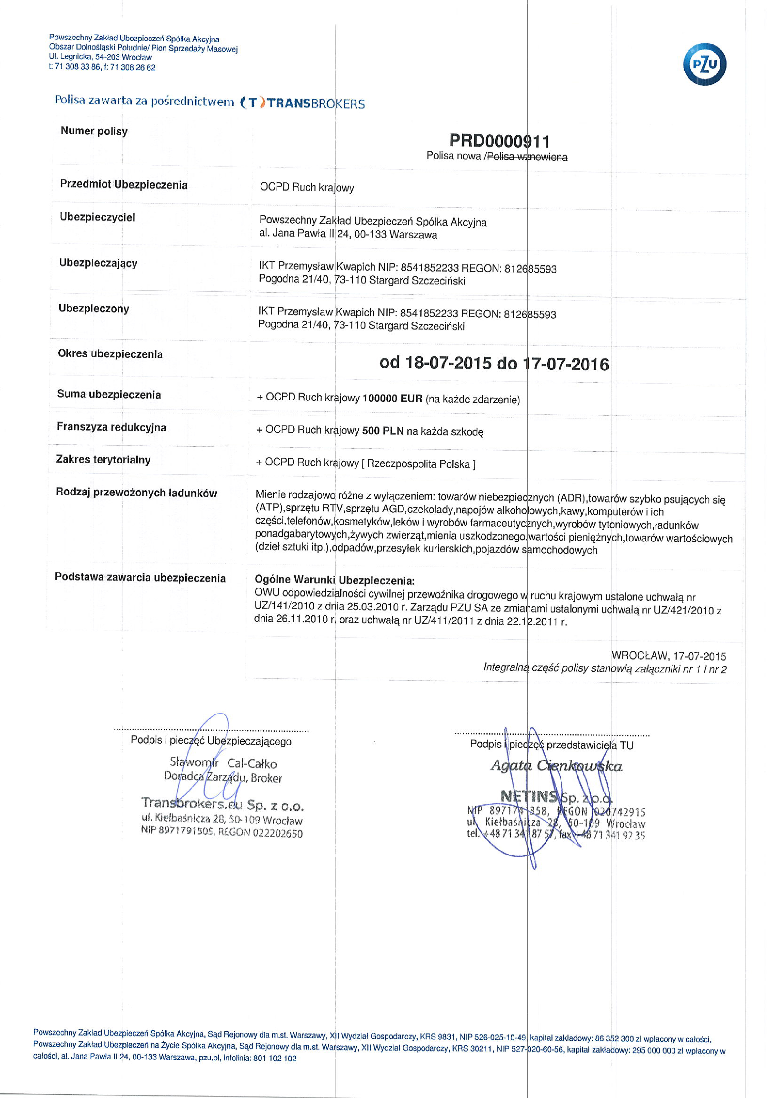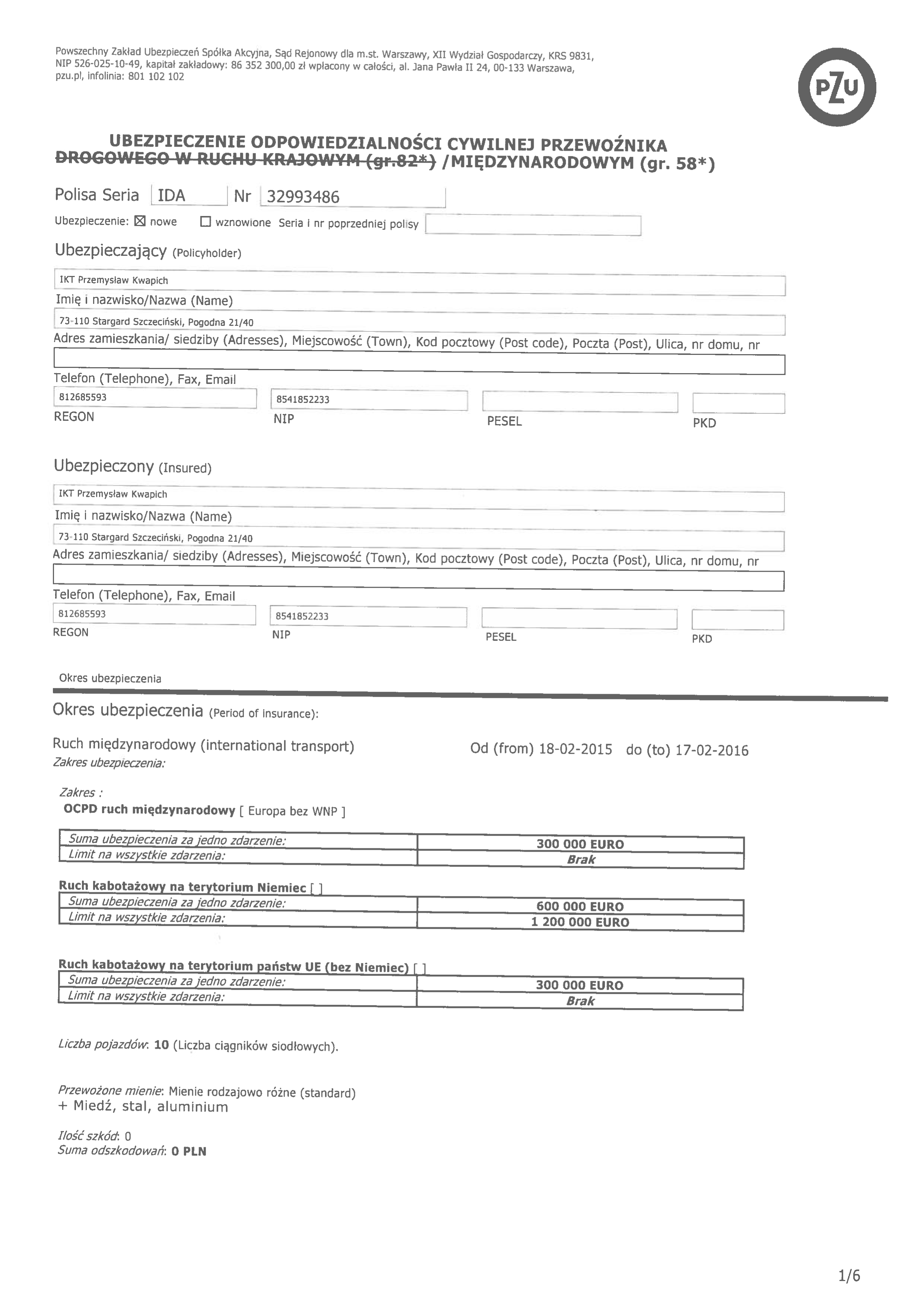 - Polisa OC krajowe i międzynarodowe
